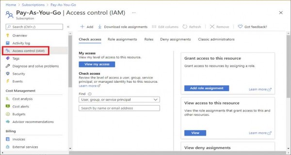 The following screenshot shows the Access control (IAM) page opened for a subscription.