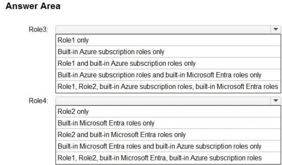 From the Azure portal, you need to create two custom roles named Role3 and Role4. Role3 will be an Azure subscription role. Role4 will be a Microsoft Entra role.
