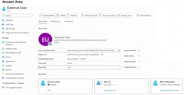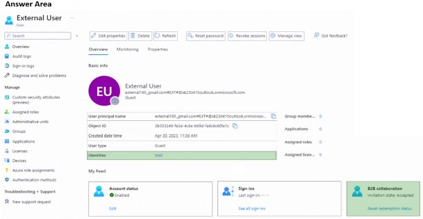 You have a Microsoft Entra tenant that contains a user named External User. External User authenticates to the tenant by using external195@gmail.com.