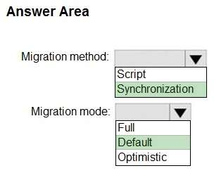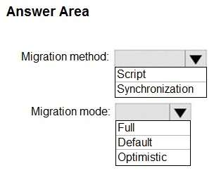 Which migration method and migration mode should you use? To answer, select the appropriate options in the answer area.