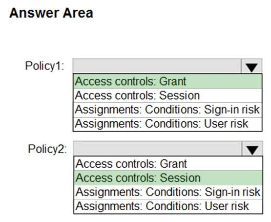 Which settings should you configure in Policy1 and Policy2? To answer, select the appropriate options in the answer area.