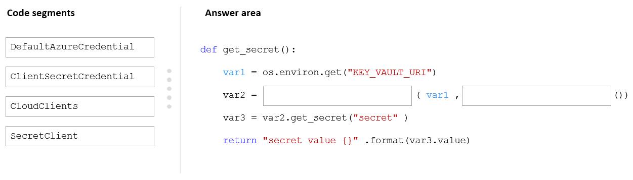 How should you complete the code segment? To answer, drag the appropriate code segments to the correct location. Each code segment may be used once, more than once, or not at all. You may need to drag the split bar between panes or scroll to view content.
