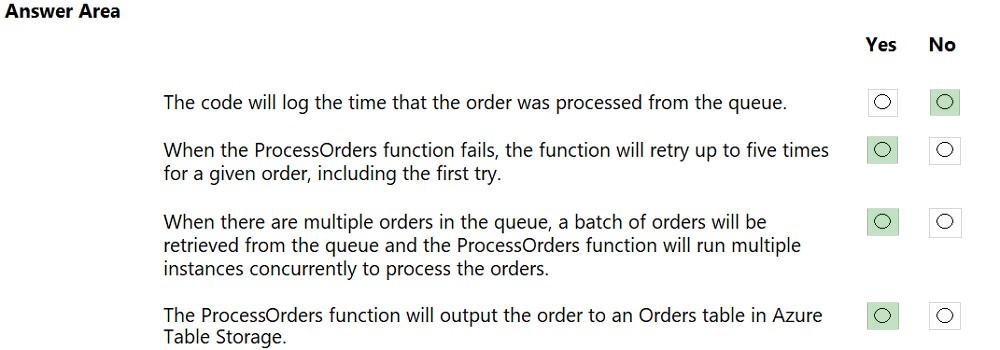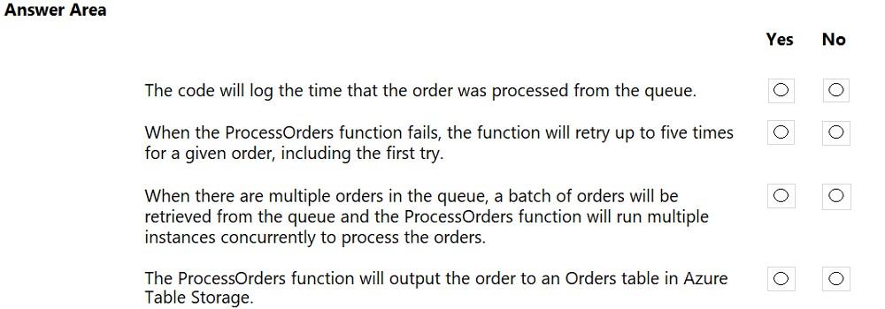 You are developing an Azure Function App by using Visual Studio. The app will process orders input by an Azure Web App. The web app places the order information into Azure Queue Storage.