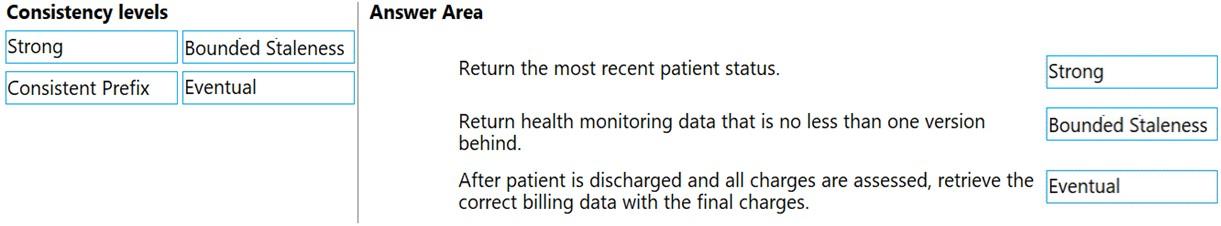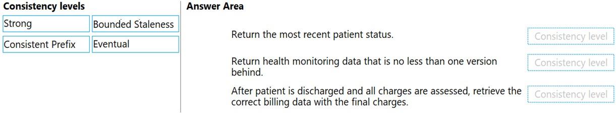 Which consistency levels should you implement? To answer, drag the appropriate consistency levels to the correct requirements. Each consistency level may be used once, more than once, or not at all. You may need to drag the split bar between panes or scroll to view content.