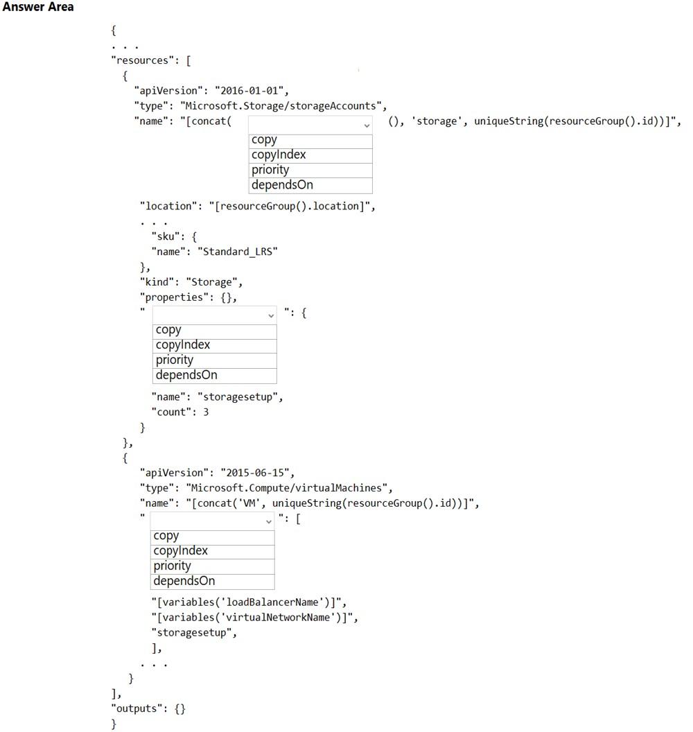 How should you complete the Azure Resource Manager template? To answer, select the appropriate options in the answer area.