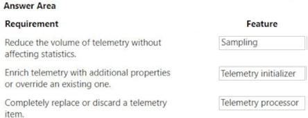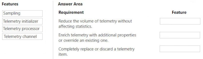 Which Application Insights SDK features should you use? To answer, drag the appropriate features to the correct requirements. Each feature may be used once, more than once, or not at all. You may need to drag the split bar between panes or scroll to view content.