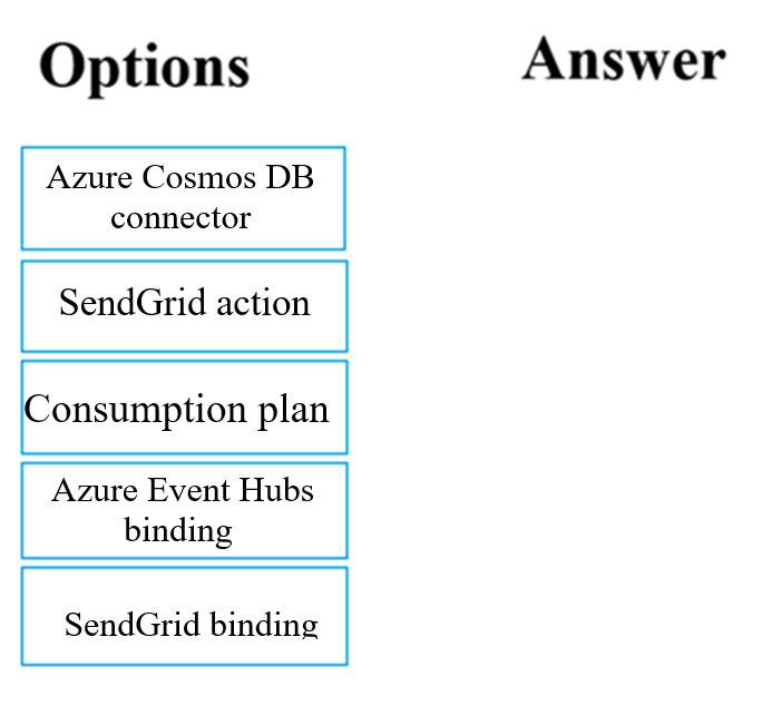 Which of the following should you configure the function app to use? Answer by dragging the correct options from the list to the answer area.