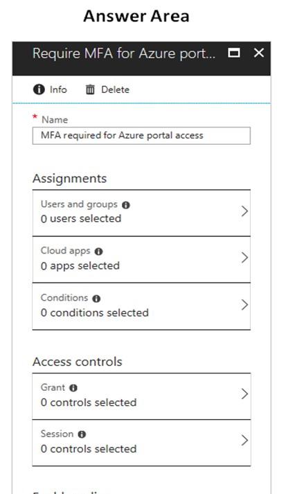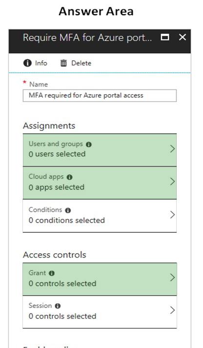You want to implement multi-factor authentication by making use of a conditional access policy. The conditional access policy must be applied to all users when they access the Azure portal.