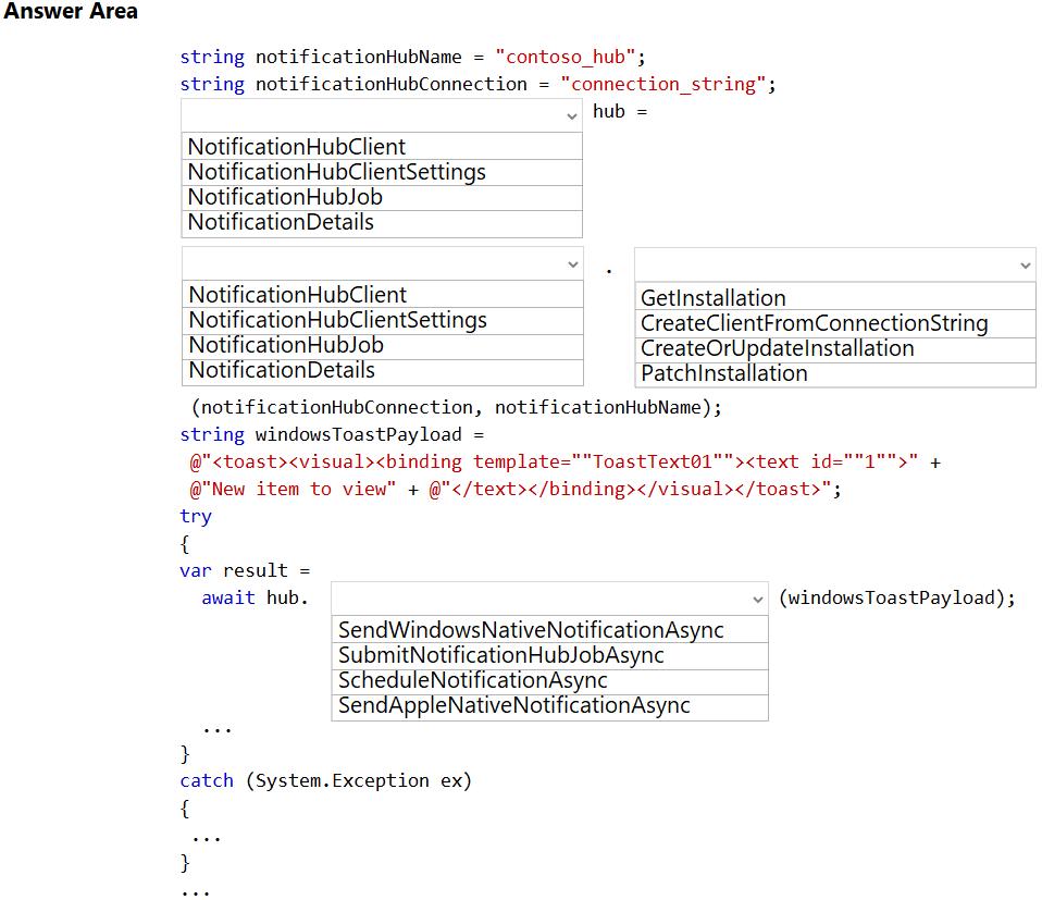 How should you complete the code segment? To answer, select the appropriate options in the answer area.