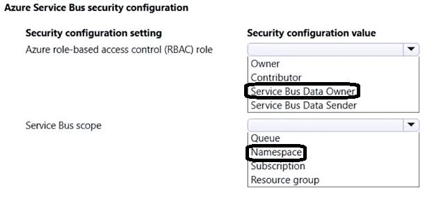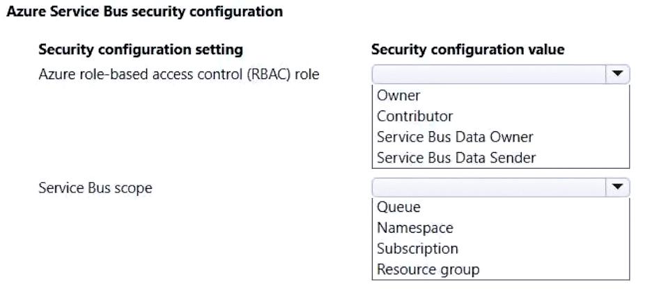 Which Service Bus security configuration should you use? To answer, select the appropriate options in the answer area.