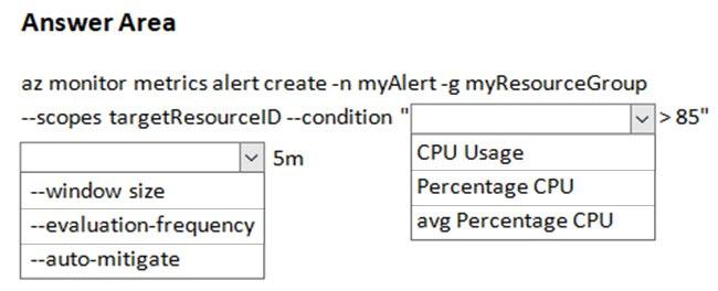 You want to be notified whenever the Web App uses more than 85 percent of the available CPU cores over a 5 minute period. Your solution must minimize costs.