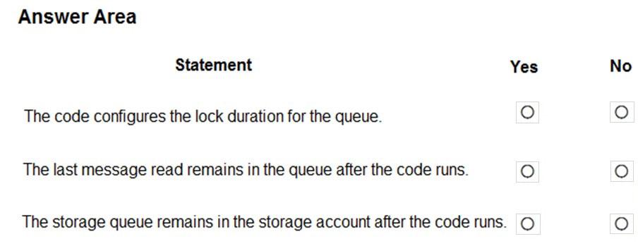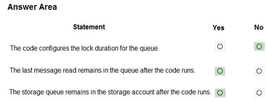 https://docs.microsoft.com/en-us/azure/storage/queues/storage-dotnet-how-to-use-queues https://docs.microsoft.com/en-us/dotnet/api/microsoft.servicebus.messaging.queuedescription.lockduration