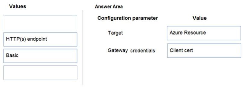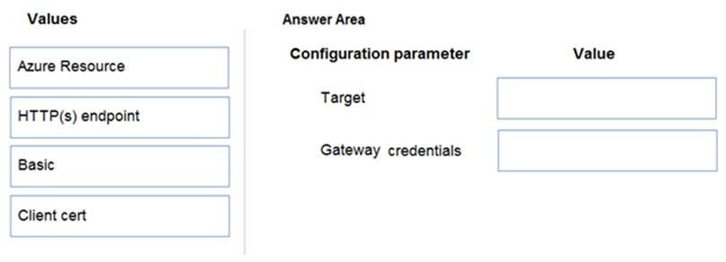 Which target and gateway credential type should you use? To answer, drag the appropriate values to the correct parameters. Each value may be used once, more than once, or not at all. You may need to drag the split bar between panes or scroll to view content.