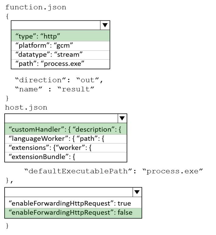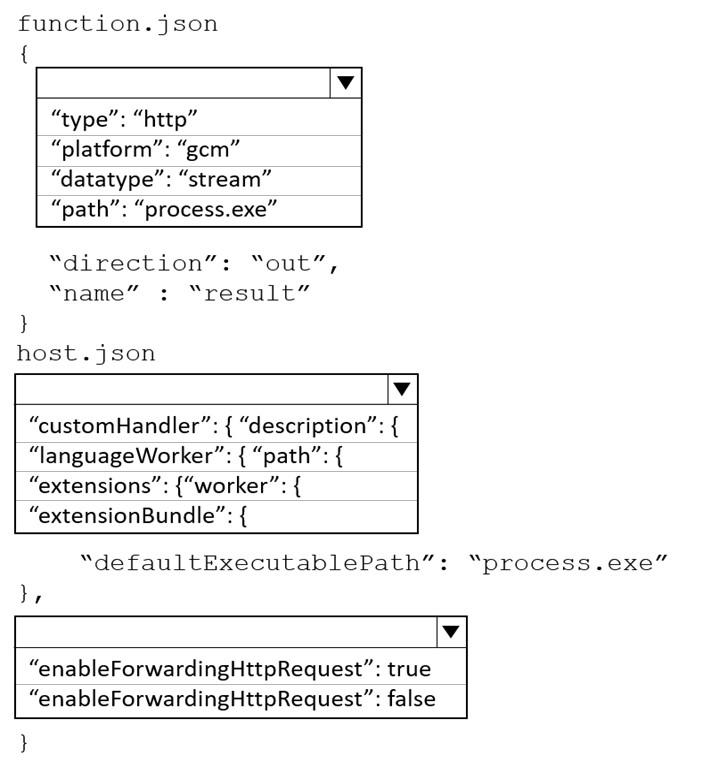 How should you complete the json files? To answer, select the appropriate options in the answer area.