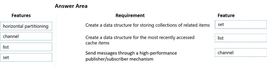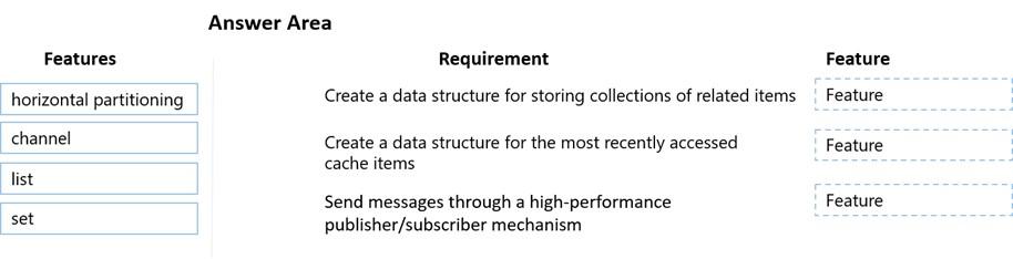 Which feature should you implement? To answer, drag the appropriate feature to the correct requirements. Each feature may be used once, more than once, or not at all. You may need to drag the split bar between panes or scroll to view content.
