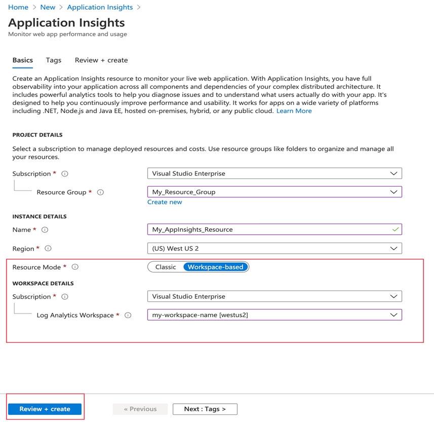 Once a workspace-based Application Insights resource has been created, configuring monitoring is relatively straightforward.