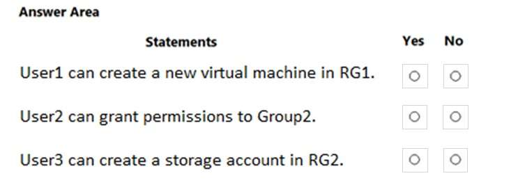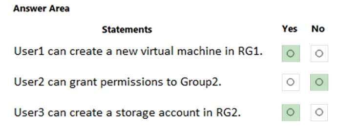 Group3 is assigned the Contributor role for the Tenant Root Group. As a member of the Tenant Root Group User3 can create storage accounts in RG2.
