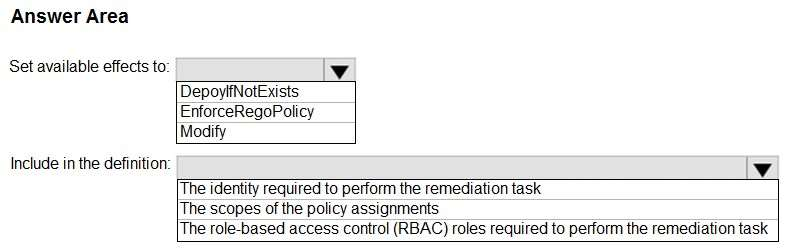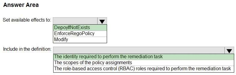 Box 2: The identity required to perform the remediation task Policy assignments with effect set as DeployIfNotExists require a managed identity to do remediation.