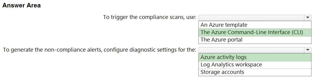 An evaluation scan for a subscription or a resource group can be started with Azure CLI, Azure PowerShell, a call to the REST API, or by using the Azure Policy Compliance Scan GitHub Action. This scan is an asynchronous process.