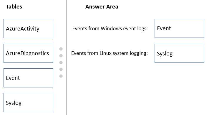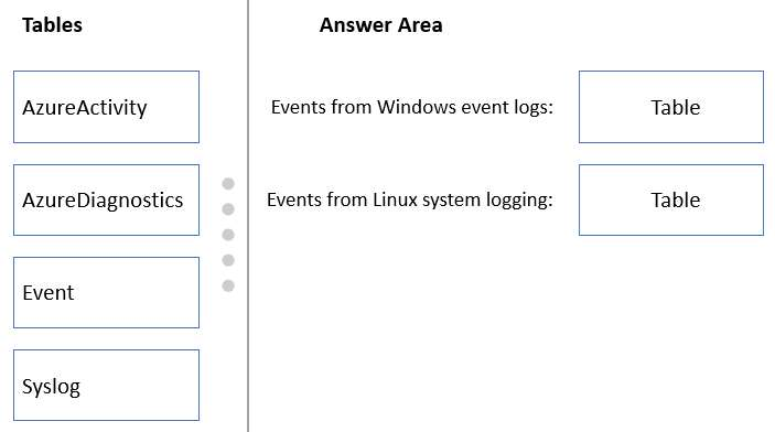 Which Azure Monitor Logs tables should you query? To answer, drag the appropriate tables to the correct log types. Each table may be used once, more than once, or not at all. You may need to drag the split bar between panes or scroll to view content.