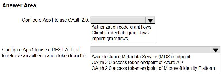 You need to configure App1 to use a system-assigned managed identity to retrieve secrets from KV1. The solution must minimize development effort.
