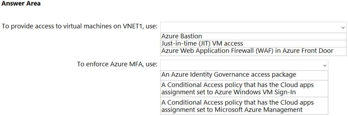 Box 2: A conditional Access policy that has Cloud Apps assignment set to Azure Windows VM Sign-In You can enforce Conditional Access policies such as multi-factor authentication or user sign-in risk check before authorizing access to Windows VMs in Azure that are enabled with Microsoft Entra sign in. To apply Conditional Access policy, you must select the “Azure Windows VM Sign-In” app from the cloud apps or actions assignment option and then use Sign-in risk as a condition and/or require multi-factor authentication as a grant access control.
