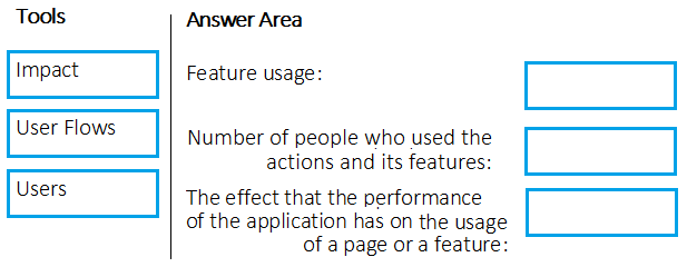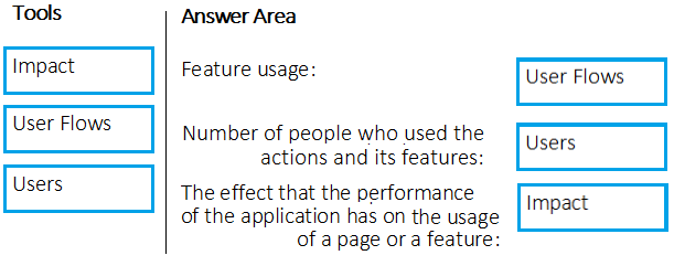 Which Application Insights tool should you use to analyze each behavior? To answer, drag the appropriate tools to the correct behaviors. Each tool may be used once, more than once, or not at all. You may need to drag the split bar between panes or scroll to view content.