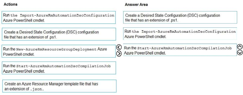 Step 3: Run the Start-AzureRmAutomationDscCompilationJob Azure Powershell cmdlet The Start-AzureRmAutomationDscCompilationJob cmdlet compiles an APS Desired State Configuration (DSC) configuration in Azure Automation.