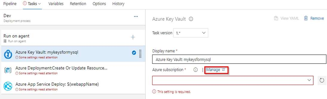 3. Under Tasks, notice the release definition for Dev stage has a Azure Key Vault task. This task downloads Secrets from an Azure Key Vault. You will need to point to the subscription and the Azure Key Vault resource.