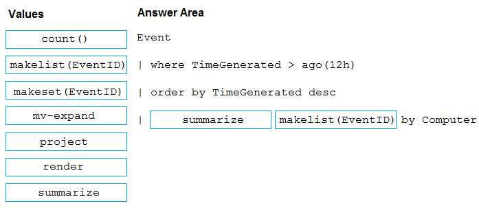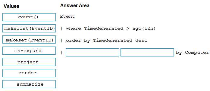 How should you complete the Azure Monitor query? To answer, drag the appropriate values to the correct locations. Each value may be used once, more than once, or not at all. You may need to drag the split bar between panes or scroll to view content.