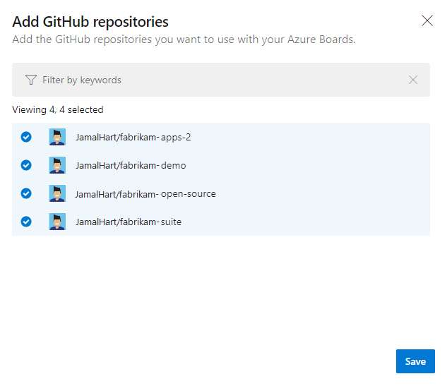 4. The Add GitHub Repositories dialog automatically displays and selects all GitHub.com repositories for which you are an administrator. Unselect any repositories that you don't want to participate in the integration.