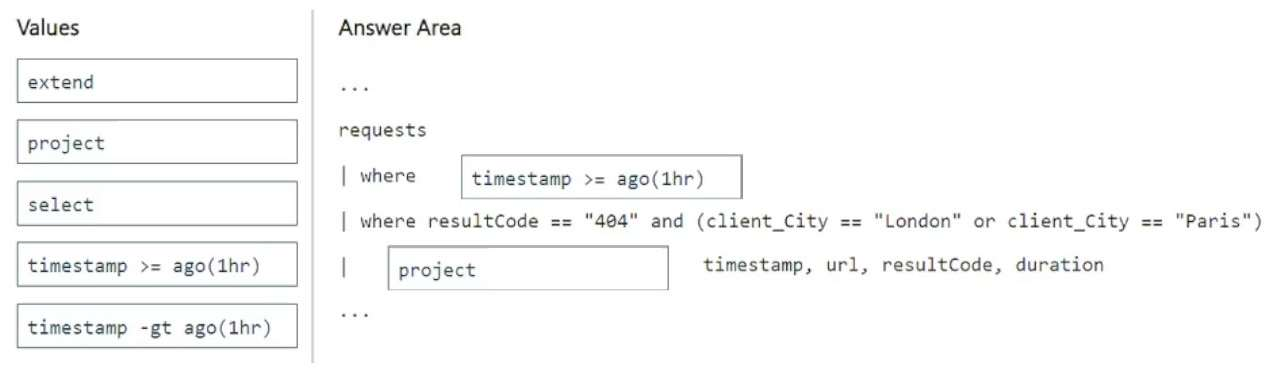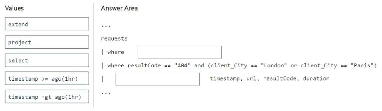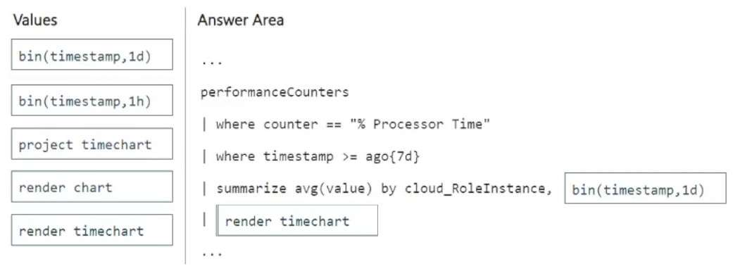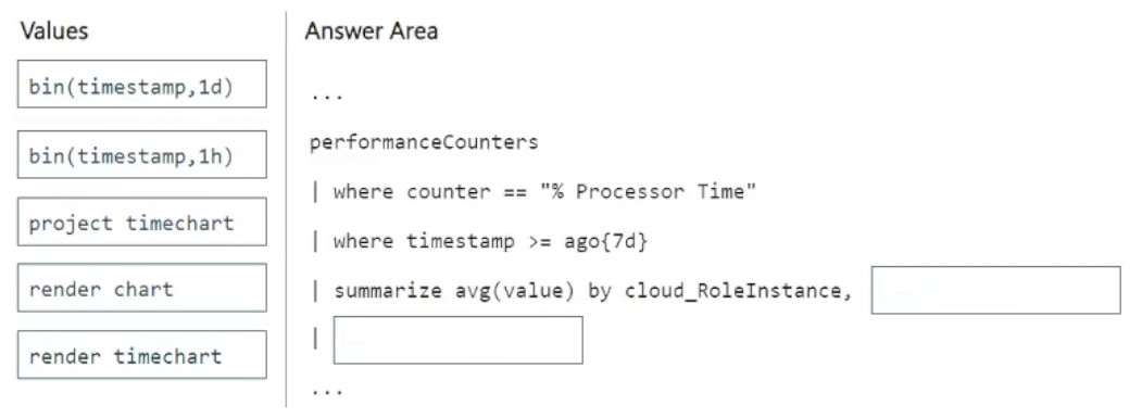 How should you complete the query? To answer, drag the appropriate values to the correct targets. Each value may be used once, more than once, or not at all. You may need to drag the split bar between panes or scroll to view content.