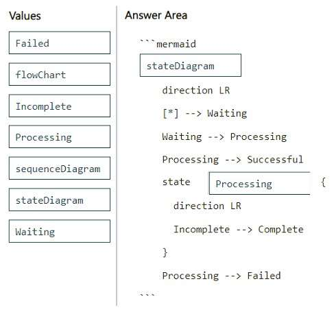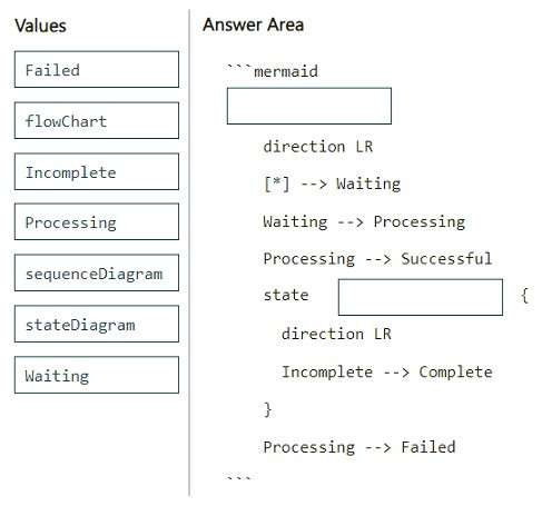 How should you complete the markdown code? To answer, drag the appropriate values to the correct targets. Each value may be used once, more than once, or not at all. You may need to drag the split bar between panes or scroll to view content.