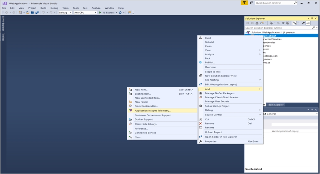 1. Open your ASP.NET Core Web App project in Visual Studio > Right-click on the AppName in the Solution Explorer > Select Add > Application Insights Telemetry.