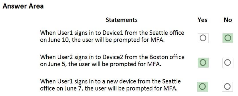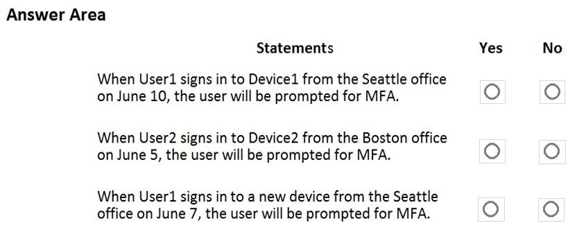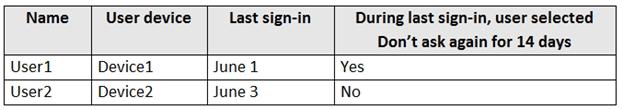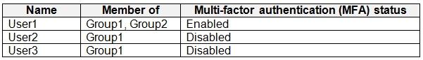 Contoso has an Azure Active Directory (Azure AD) tenant named contoso.com. All contoso.com users have Azure Multi-Factor Authentication (MFA) enabled. The tenant contains the users shown in the following table.