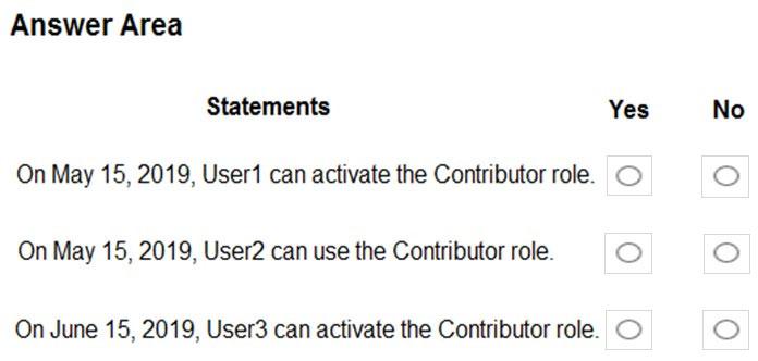 You assign users the Contributor role on May 1, 2019 as shown in the following table.