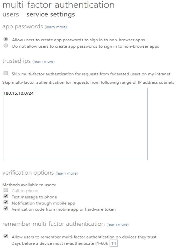 The multi-factor authentication settings for contoso.com are configured as shown in the following exhibit.