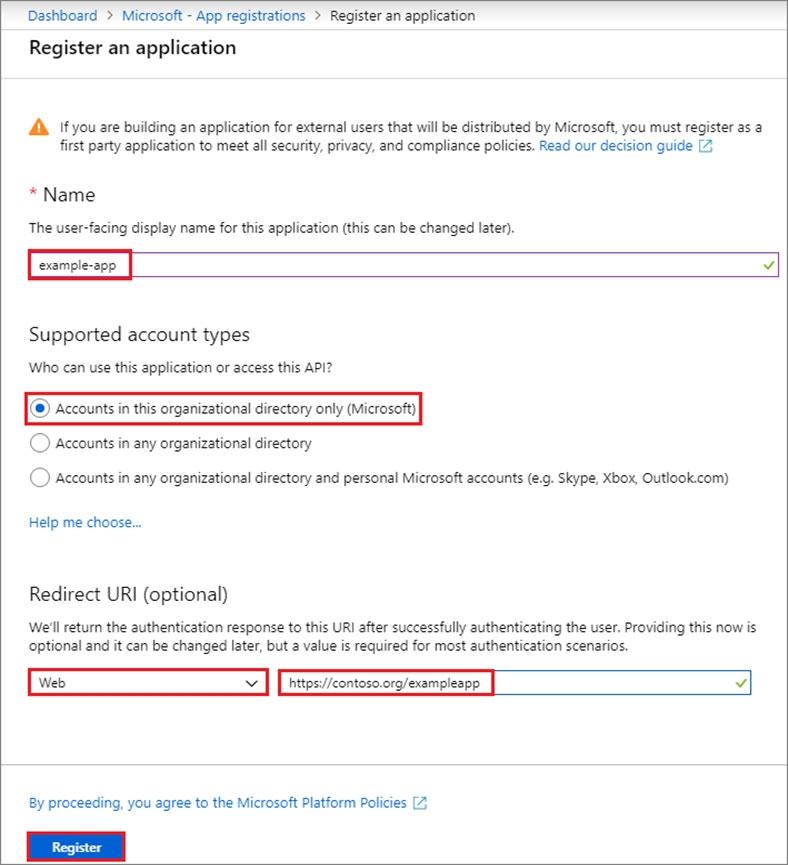 5. Name the application App12345678. Select a supported account type, which determines who can use the application. Under Redirect URI, select Web for the type of application you want to create. Enter the URI: https://app.contoso.com , where the access token is sent to.