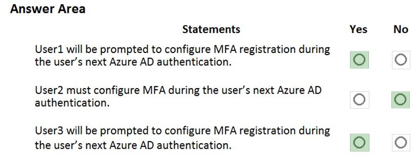 You configure a multi-factor authentication (MFA) registration policy that has the following settings:
