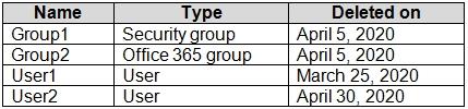 On May 4, 2020, you attempt to restore the deleted objects by using the Azure Active Directory admin center.