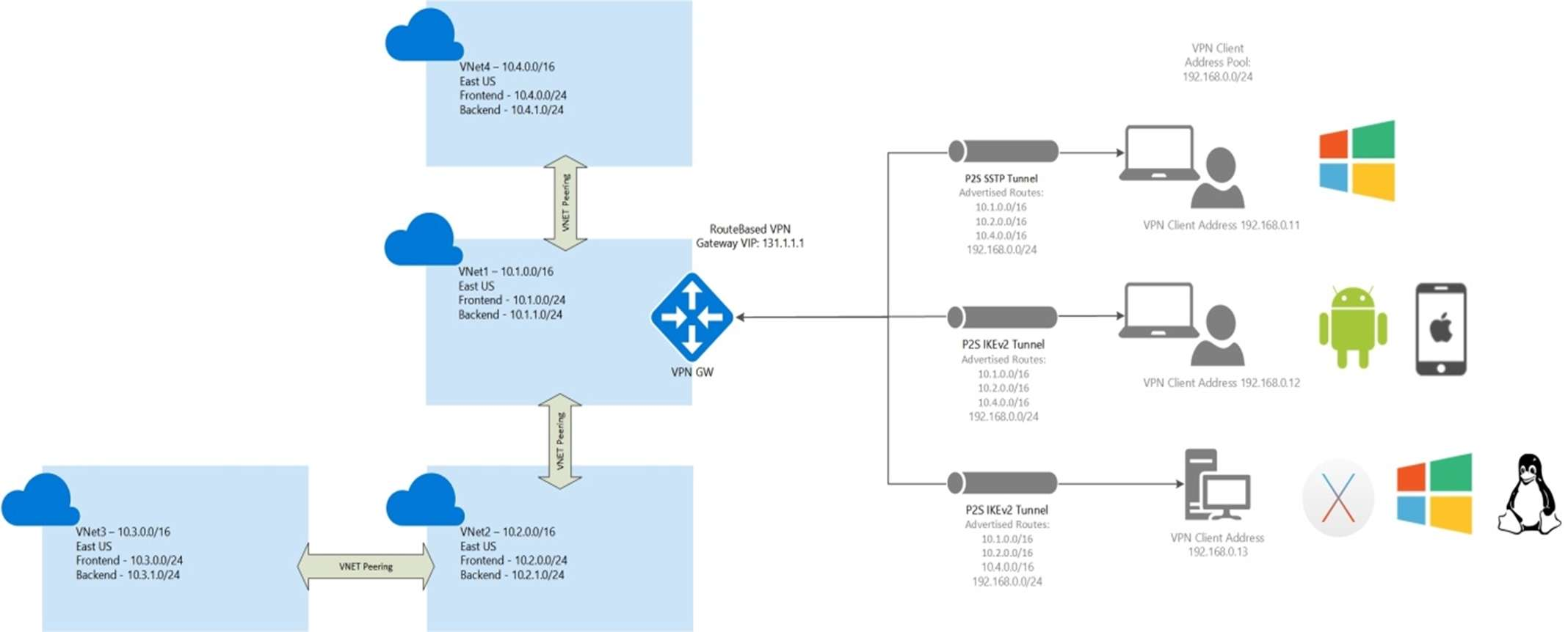 Azure Point-to-Site VPN routing behavior is dependent on the client OS, the protocol used for the VPN connection, and how the virtual networks (VNets) are connected to each other.