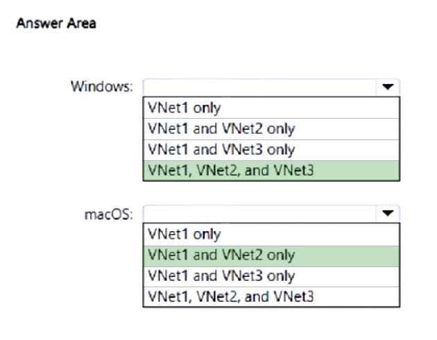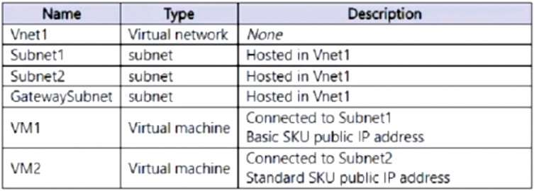 The on-premises network is connected to VNet1 by using ExpressRoute. The on-premises network is inaccessible from VNet2.