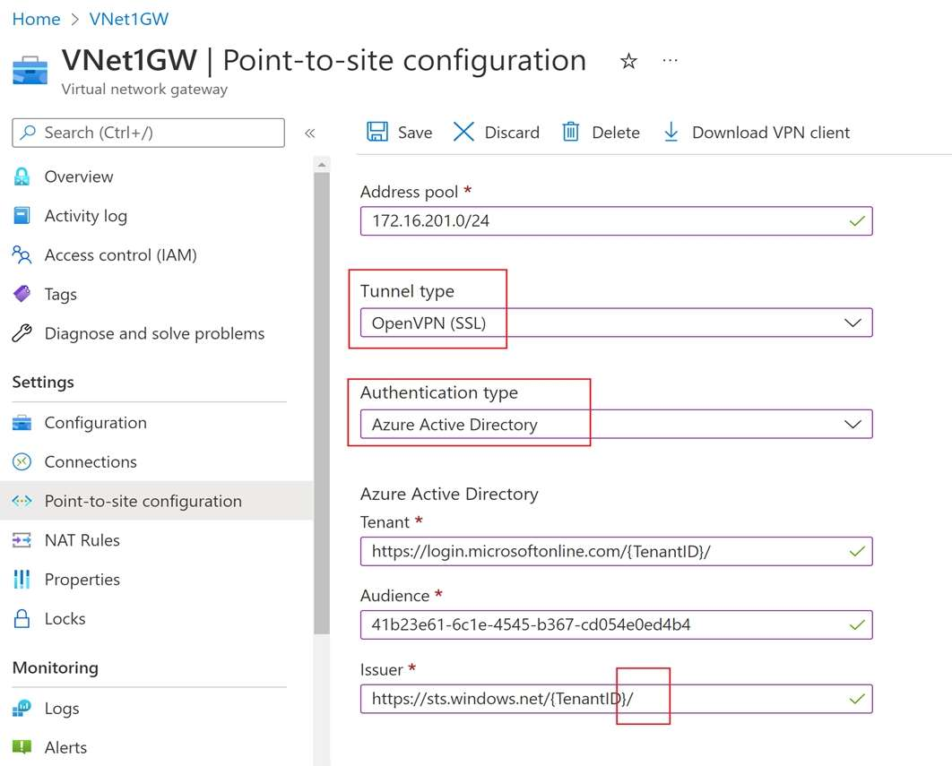 Step 2: From the Azure portal, configure the tunnel type and authentication type for VPNGW1.