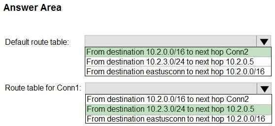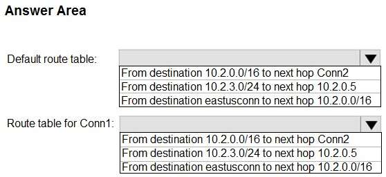 Box 2: From destination 10.2.3.0/24 to the next hop 10.2.0.5 Route table for Conn1
