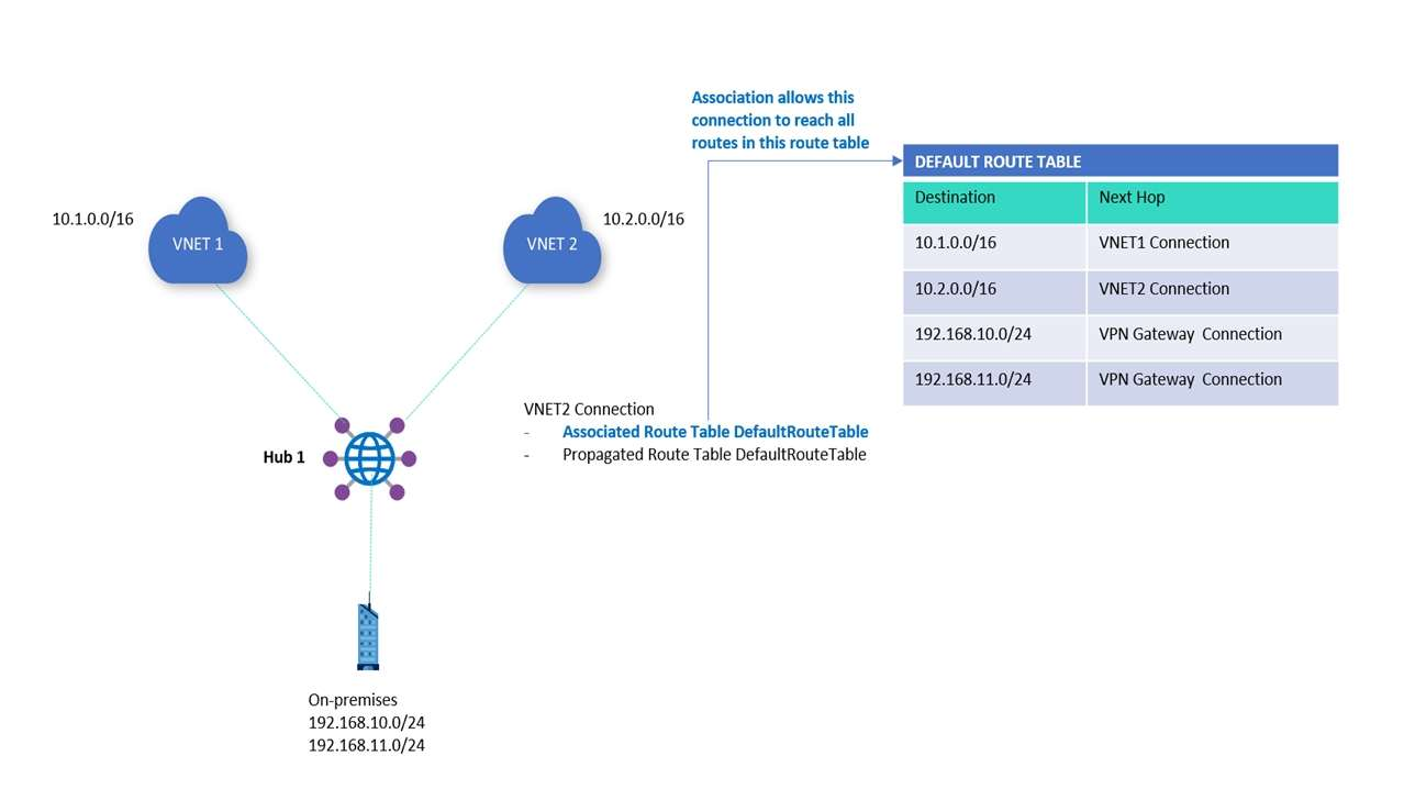Each connection is associated to one route table. Associating a connection to a route table allows the traffic (from that connection) to be sent to the destination indicated as routes in the route table. The routing configuration of the connection shows the associated route table. Multiple connections can be associated to the same route table. All VPN, ExpressRoute, and User VPN connections are associated to the same (default) route table.