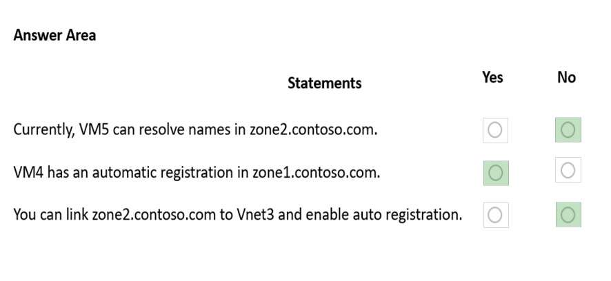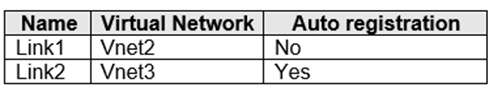 VNet3 is linked to zone1.contoso.com and auto-registration is enabled on the link. A virtual network can only have one registration zone. You can link zone2.contoso.com to VNet3 but you won't be able to enable auto- registration on the link.
