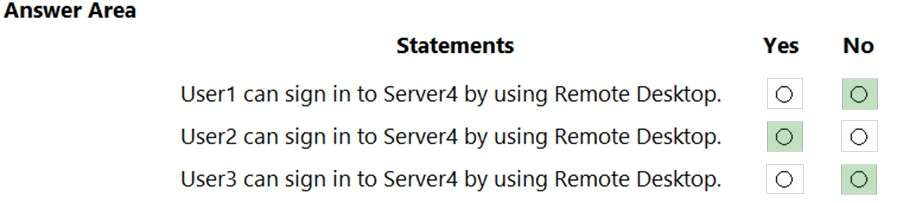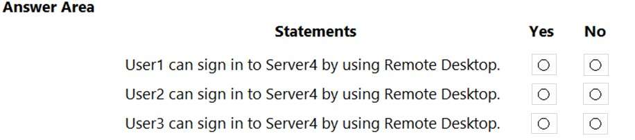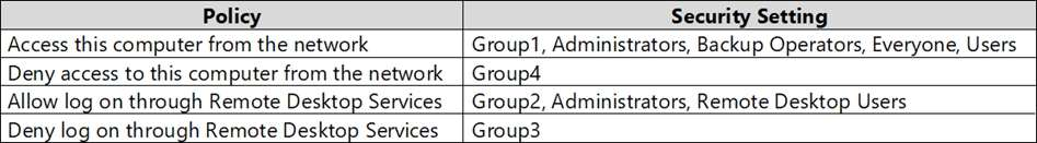 Server4 has the effective Group Policy settings for user rights as shown in the following table.