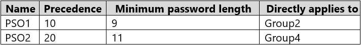 The contoso.com domain has the Password Settings Objects (PSOs) shown in the following table.