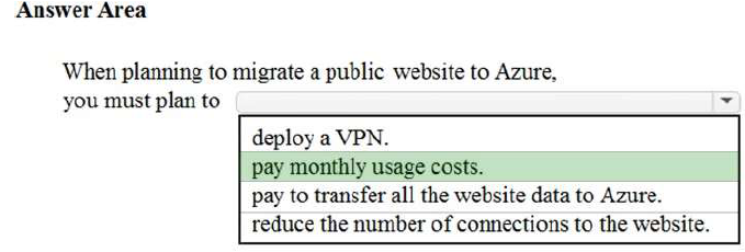 When planning to migrate a public website to Azure, you must plan to pay monthly usage costs. This is because Azure uses the pay-as-you-go model.