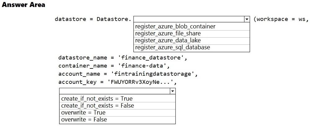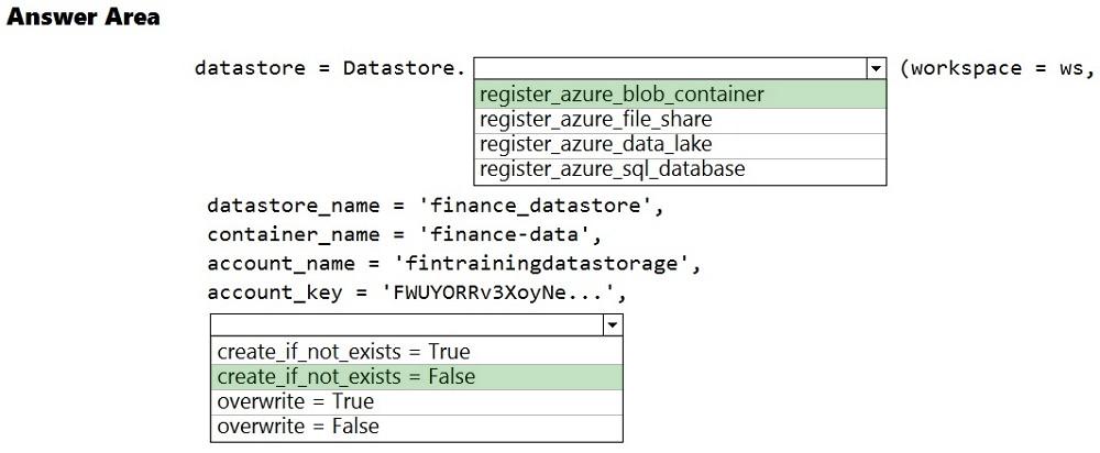 The finance team asks you to train a model using data in an Azure Storage blob container named finance-data.